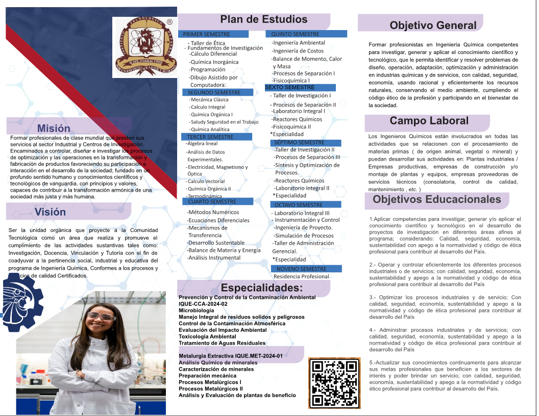 Formar profesionistas en Ingeniería Química competentes para investigar, generar y aplicar el conocimiento científico y tecnológico, que le permita identificar y resolver problemas de diseño, operación, adaptación, optimización y administración en industrias químicas y de servicios, con calidad, seguridad, economía, usando racional y eficientemente los recursos naturales, conservando el medio ambiente, cumpliendo el código ético de la profesión y participando en el bienestar de la sociedad.
