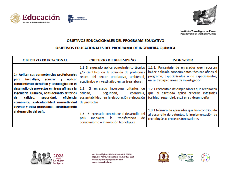1.- Aplicar sus competencias profesionales para investigar, generar y aplicar conocimiento científico y tecnológico en el desarrollo de proyectos en áreas afines a la Ingeniería Química, considerando criterios de calidad, seguridad, eficiencia económica, sustentabilidad, normatividad vigente y ética profesional, contribuyendo al desarrollo del país.