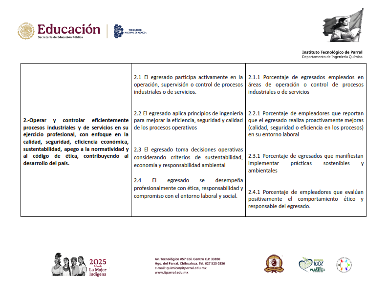 2.-Operar y controlar eficientemente procesos industriales y de servicios en su ejercicio profesional, con enfoque en la calidad, seguridad, eficiencia económica, sustentabilidad, apego a la normatividad y al código de ética, contribuyendo al desarrollo del país.