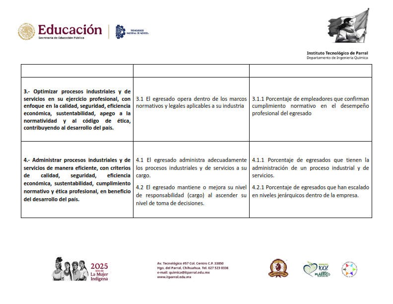 3.- Optimizar procesos industriales y de servicios en su ejercicio profesional, con enfoque en la calidad, seguridad, eficiencia económica, sustentabilidad, apego a la normatividad y al código de ética, contribuyendo al desarrollo del país.