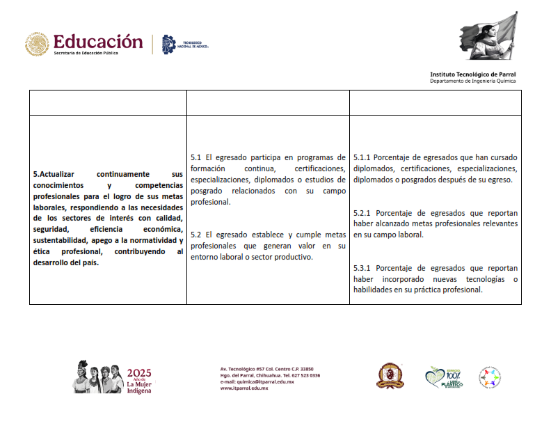 5.-.Actualizar continuamente sus conocimientos y competencias profesionales para el logro de sus metas laborales, respondiendo a las necesidades de los sectores de interés con calidad, seguridad, eficiencia económica, sustentabilidad, apego a la normatividad y ética profesional, contribuyendo al desarrollo del país.